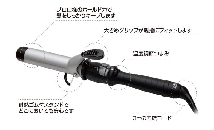 プロも納得の充実した機能性。 ダイアル式の温度調整がついていますので、髪質・作りたいヘアスタイルに応じて温度設定をすることができます。 急速加熱、100~190℃の温度調整が可能です。温度を均一に保てるマイカヒーターを使用しているのでアイロン部は熱の伝わりが常に一定していて仕上がりにムラが出ません。